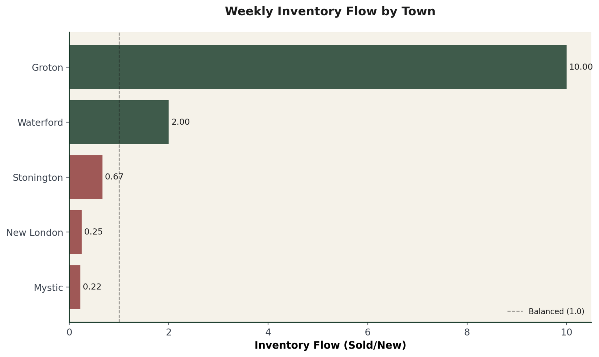 This week, Groton took the spotlight. Homes there are selling much faster than new ones are being listed, showing serious buyer momentum. Meanwhile, Mystic and Stonington saw new listings climb slightly, giving buyers a bit more breathing room.